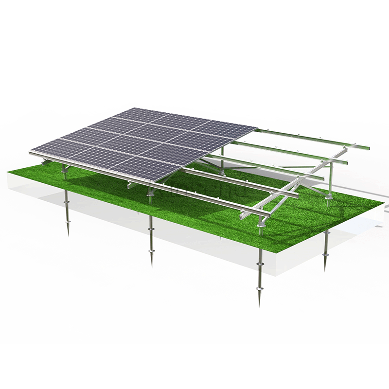 يتكون نظام التثبيت الأرضي من الألومنيوم لتثبيته على أساس خرساني أو براغي أرضية تركيب سريع مع تقدم كبير في بناء محطة الطاقة الكهروضوئية الأرضية.