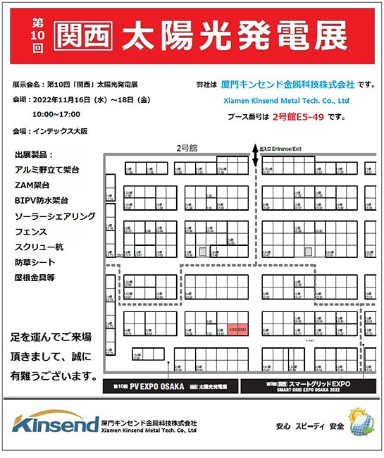 سيتم عرض Kinsend في معرض كانساي العاشر للطاقة الشمسية ، والذي سيعقد في إنتكس ، أوساكا ، في الفترة من 16 نوفمبر إلى 18 نوفمبر 2022.