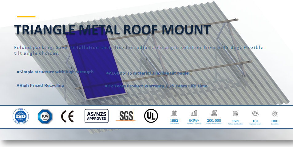 سقف معدني لوحة للطاقة الشمسية جبل زاوية ترايبود الألومنيوميمكن تثبيته على مشبك سقف معدني أو اختراق الخرسانة. التجميع المسبق العالي ، التثبيت السهل ، مثالي أيضًا للأنظمة الصغيرة من 1،2،4 أو 8 وحدات ، زاوية ثابتة ، زاوية قابلة للتعديل كلاهما متاح.