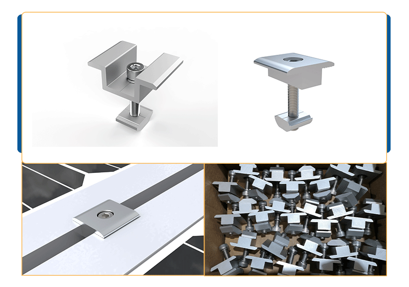 المادة الرئيسية هي AL6005-T5 بمتوسط 12 ميكرومتر من فيلم الأنودة. يتم استخدام التصميم الفريد للمشابك المتوسطة والنهاية في أنواع مختلفة من الألواح الشمسية. التصميم الخاص للسكك الحديدية يمكن أن يجعل عملية التثبيت أبسط وأسرع. تم تجميع الأجزاء بشكل عالي مسبقًا في المصنع لتوفير وقت التثبيت.